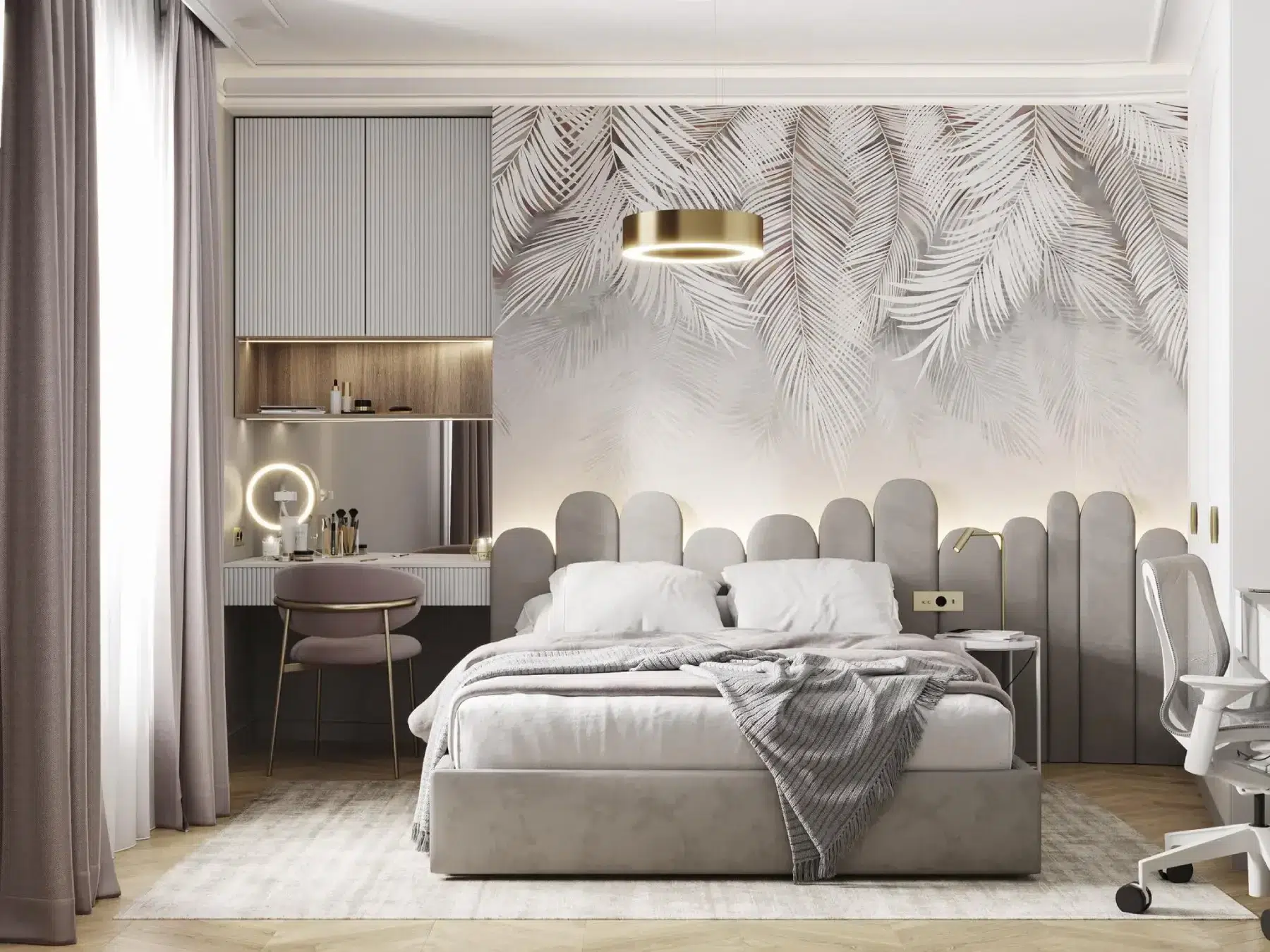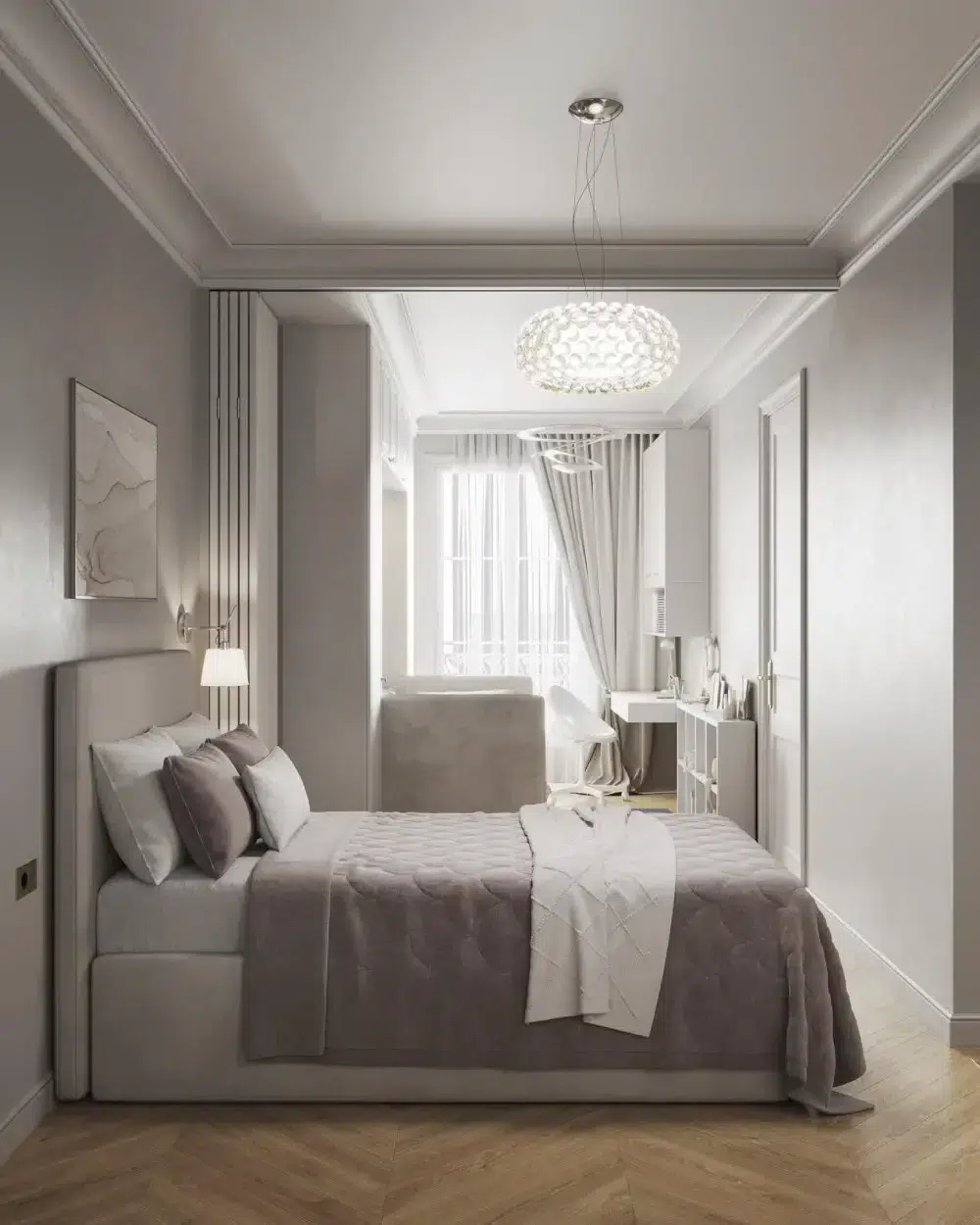 La suite parentale a été conçue comme un véritable cocon. Elle intègre un dressing indépendant et une salle d’eau privative à l’atmosphère apaisante, où la palette de beiges clairs et de matières nobles compose un univers serein, propice au repos. L’attention portée aux détails et aux finitions garantit une expérience haut de gamme, sans concession sur la fonctionnalité.