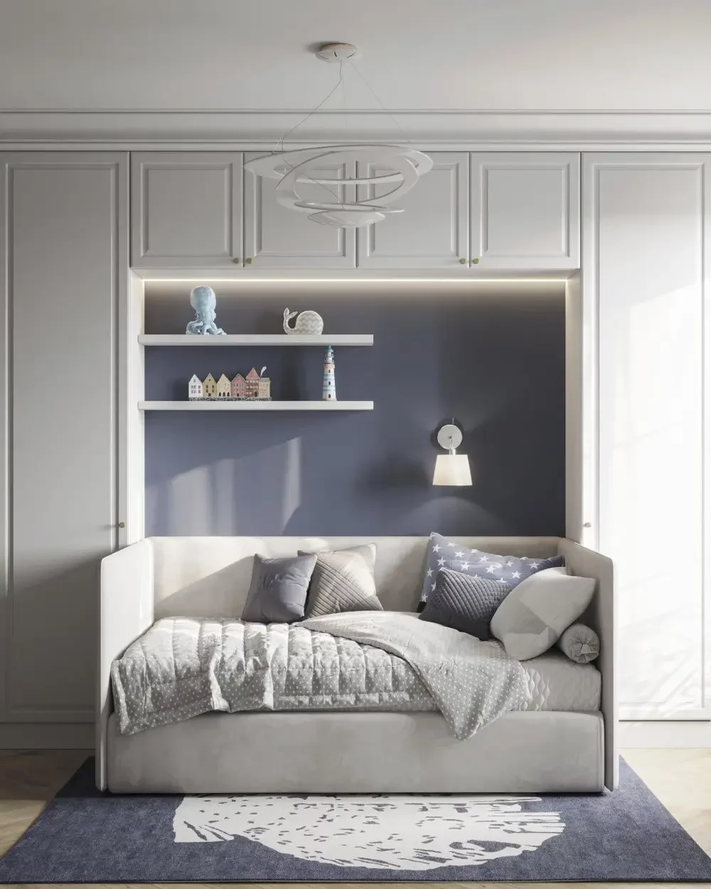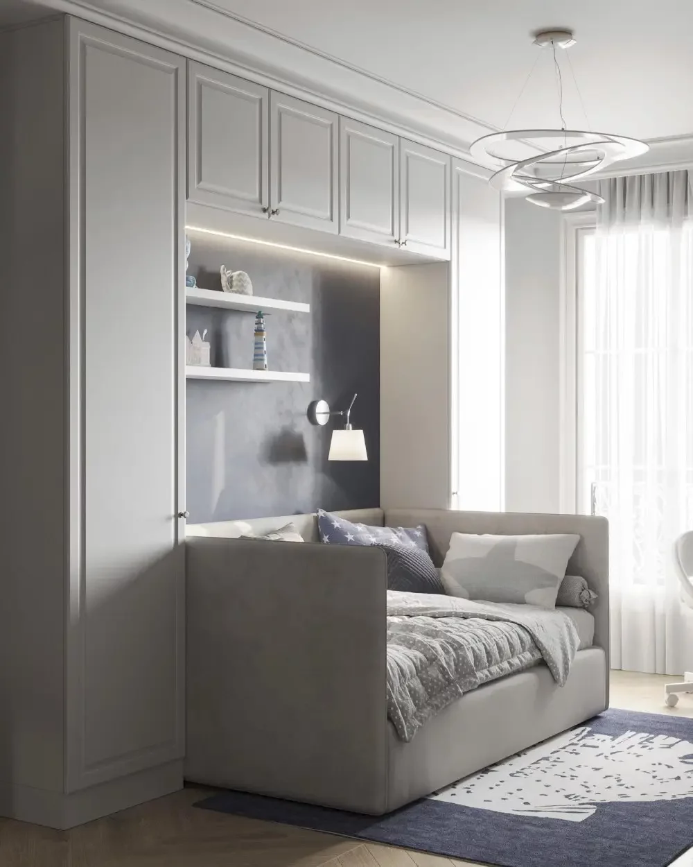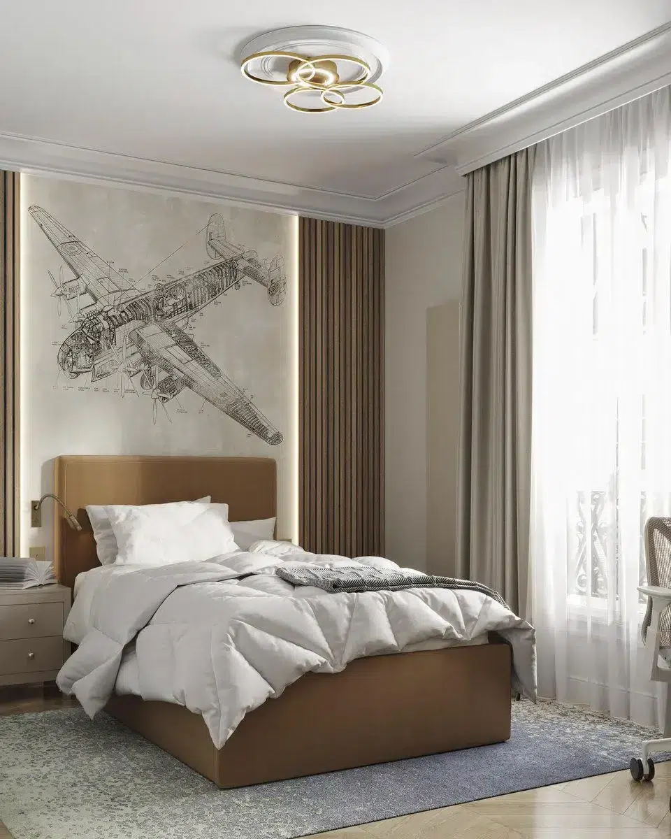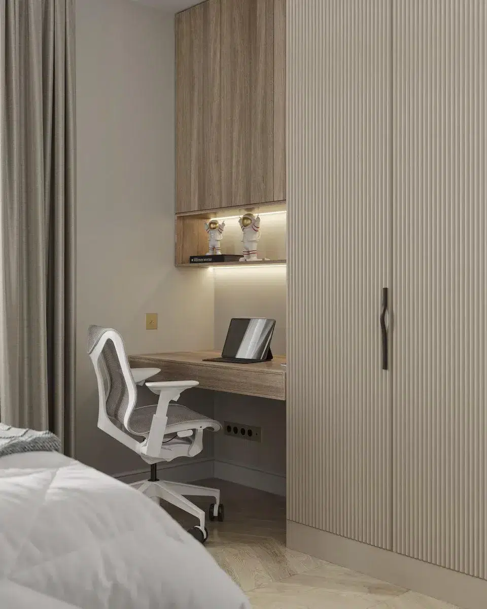 L’appartement compte trois chambres d’enfants. L’aînée dispose d’une chambre avec salle de douche attenante, favorisant l’autonomie et le confort. Les deux chambres de garçons ont été pensées pour évoluer avec leurs besoins; l’une d’elles a été intelligemment divisée grâce à une porte pliante en accordéon, créant un espace indépendant pour la nounou sans compromettre la modularité de la pièce.