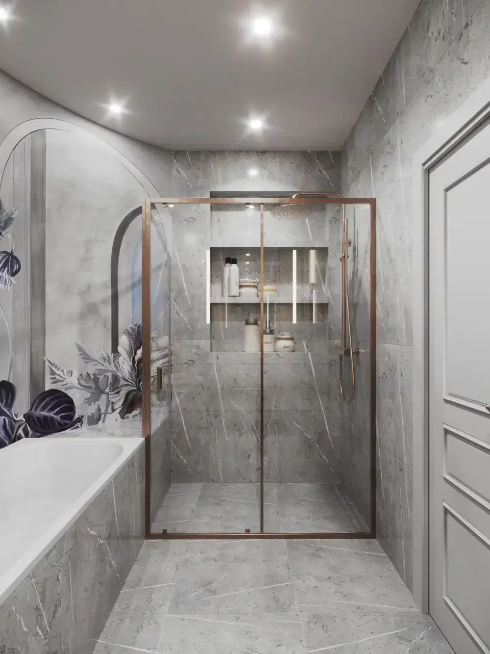 La salle de bain des enfants constitue l’un des éléments singuliers du projet. Sa forme arrondie, atypique, a été exploitée avec créativité pour intégrer une baignoire élégante, un meuble vasque sur mesure de grande dimension et une douche spacieuse agrémentée de niches rétroéclairées par des bandeaux LED. L’ensemble conjugue praticité et raffinement, avec une robinetterie Gessi et des appareillages électriques Modelec qui assurent la cohérence esthétique et technique.