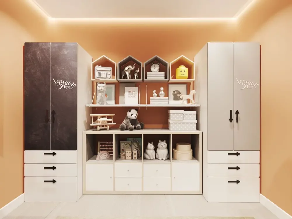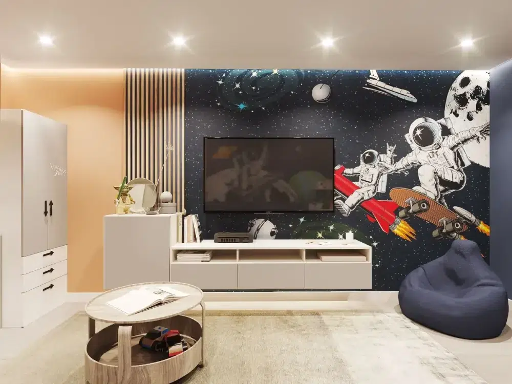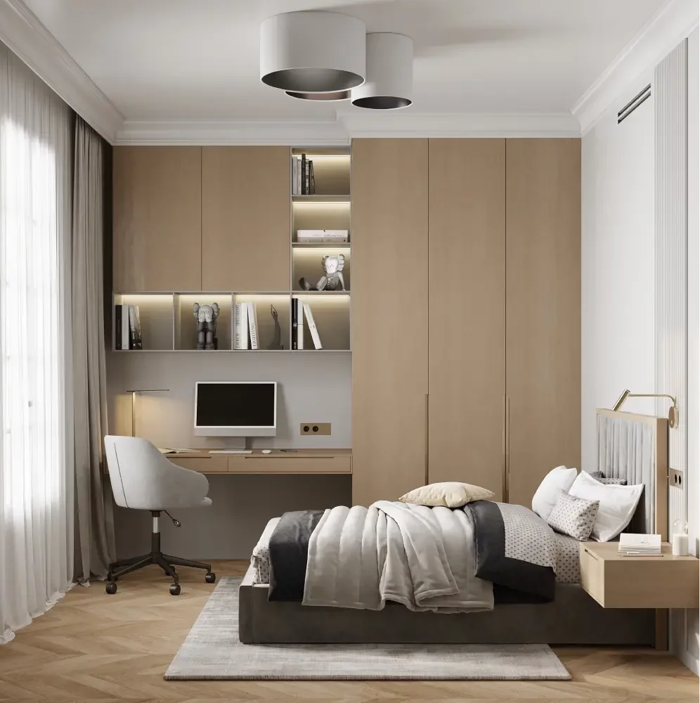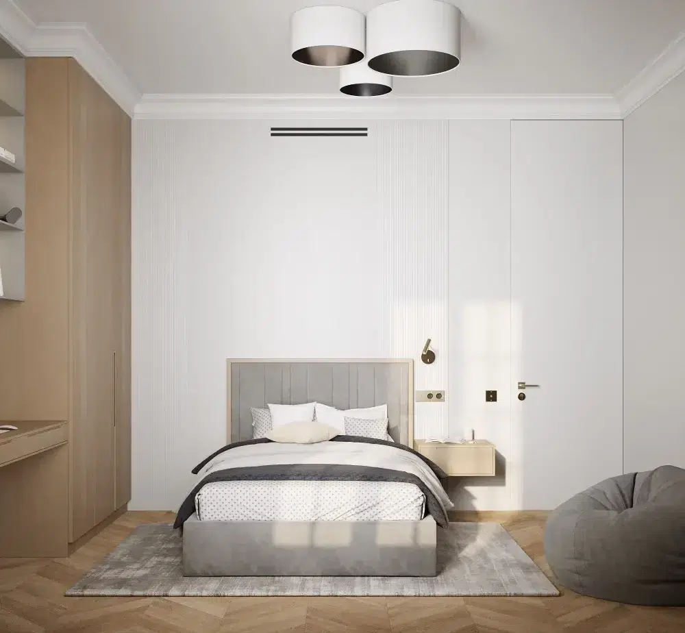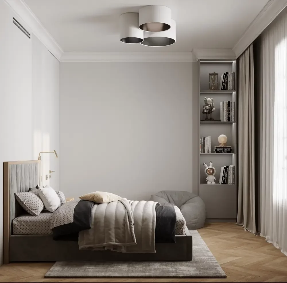 L’aménagement des 5 chambres répond à des besoins spécifiques de croissance. Dans la chambre spatiale, le mobilier sur mesure intègre des zones de couchage, de bureau et de rangement dans un bloc unifié, libérant de la surface au sol pour le jeu. Cette stratégie de « boîte dans la boîte » optimise les 390 m² en évitant l’encombrement par du mobilier mobile.