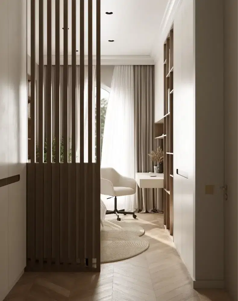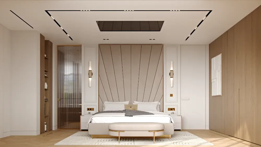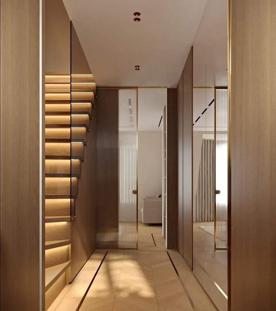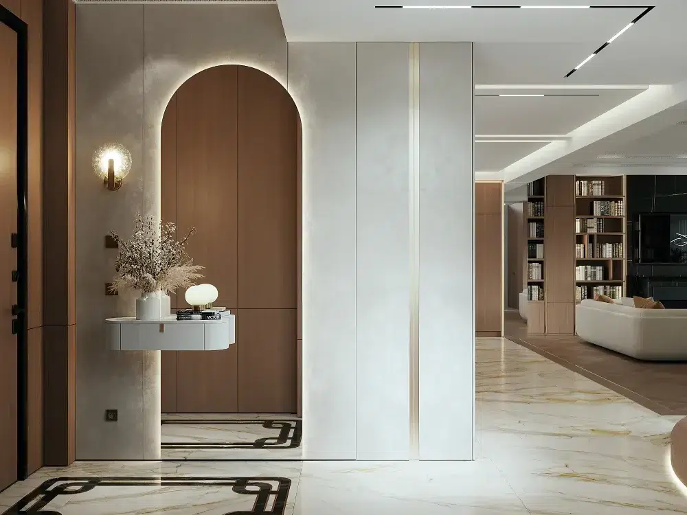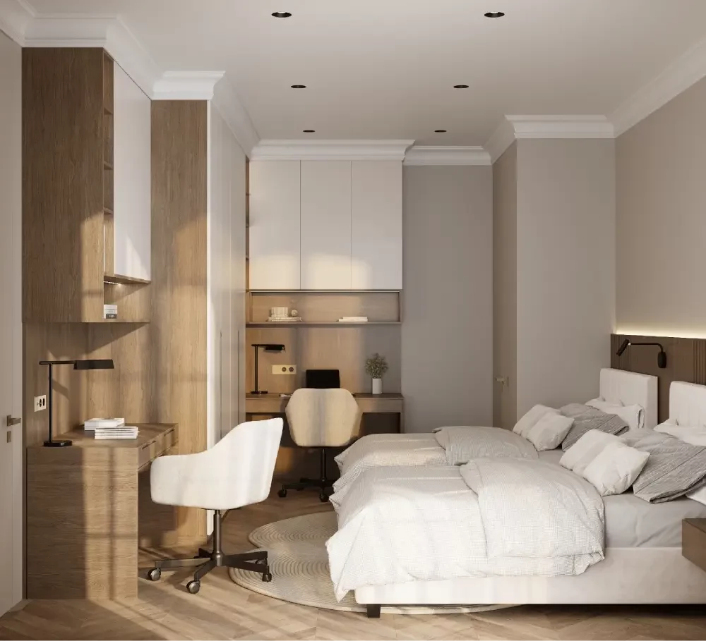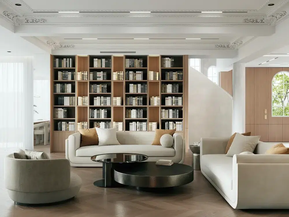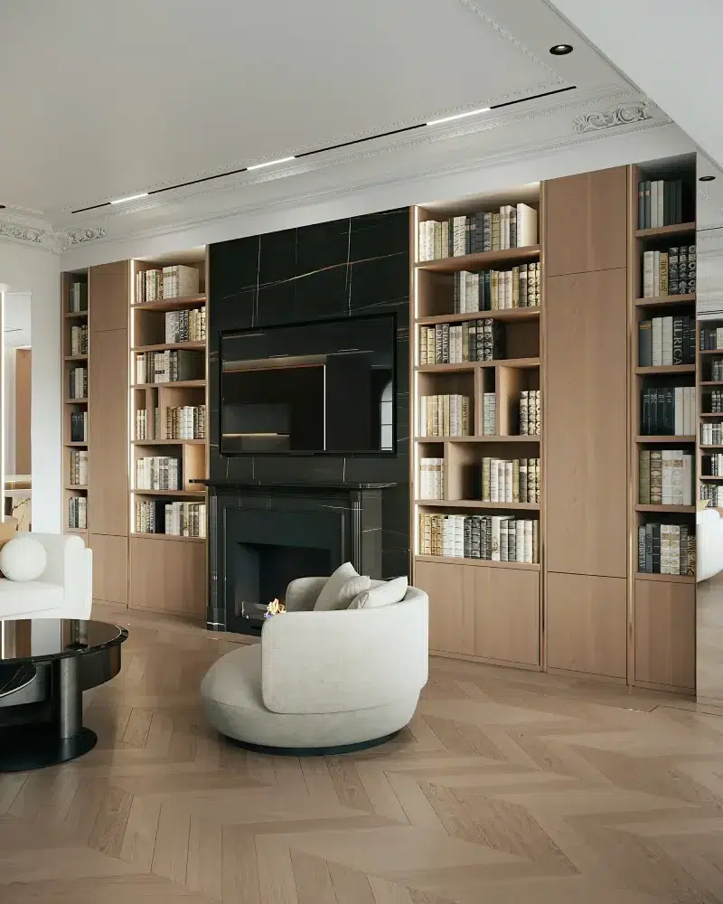 - Performance fonctionnelle : Intégration massive de rangements invisibles en chêne massif et menuiserie laquée.