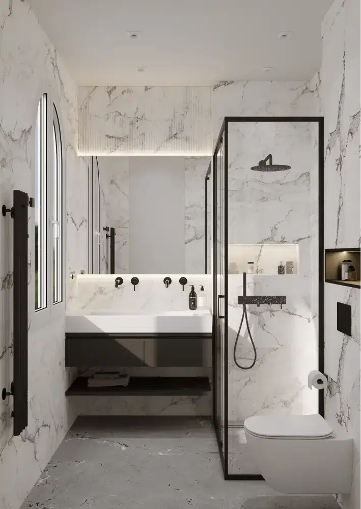 - Apport bioclimatique : Création d’une salle de bains panoramique maximisant la lumière naturelle.