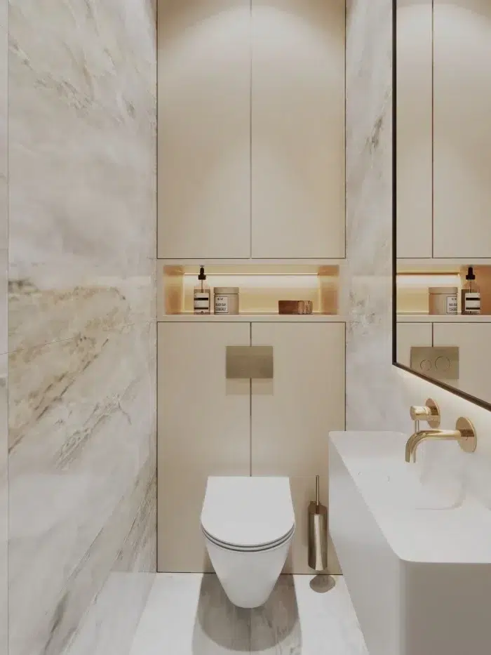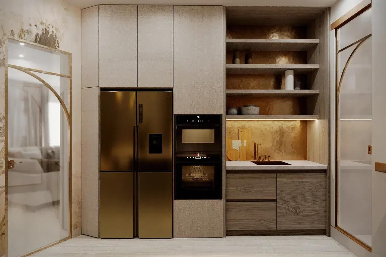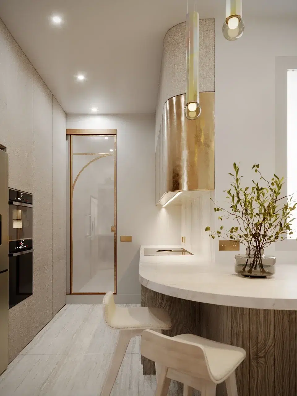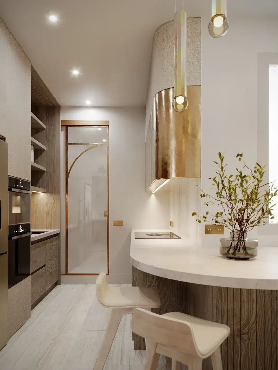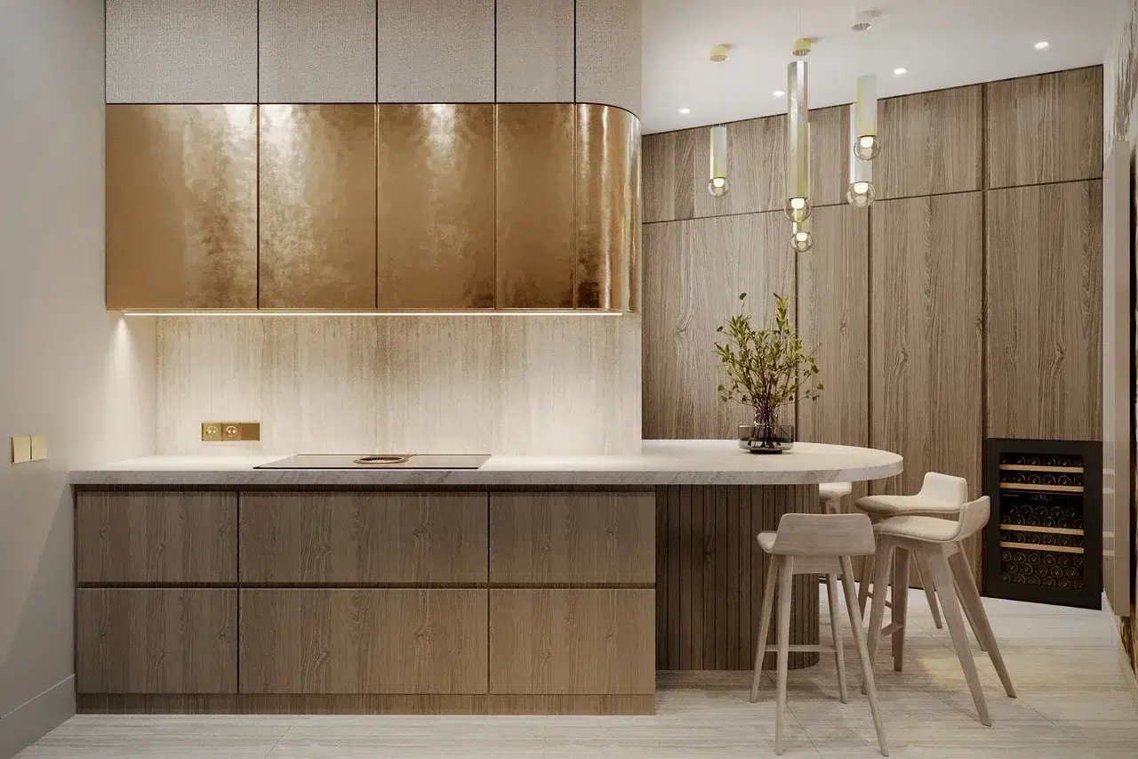 L’astuce consiste à utiliser des matériaux qui captent la lumière, comme le stratifié métallique aux reflets dorés, pour souligner les lignes singulières de l’espace tout en apportant une touche de luxe discret.