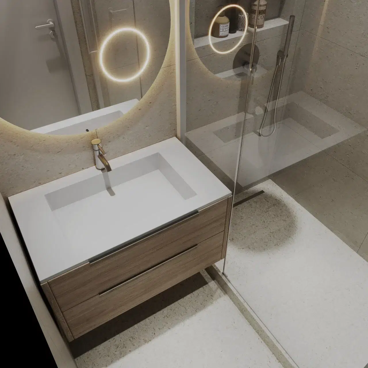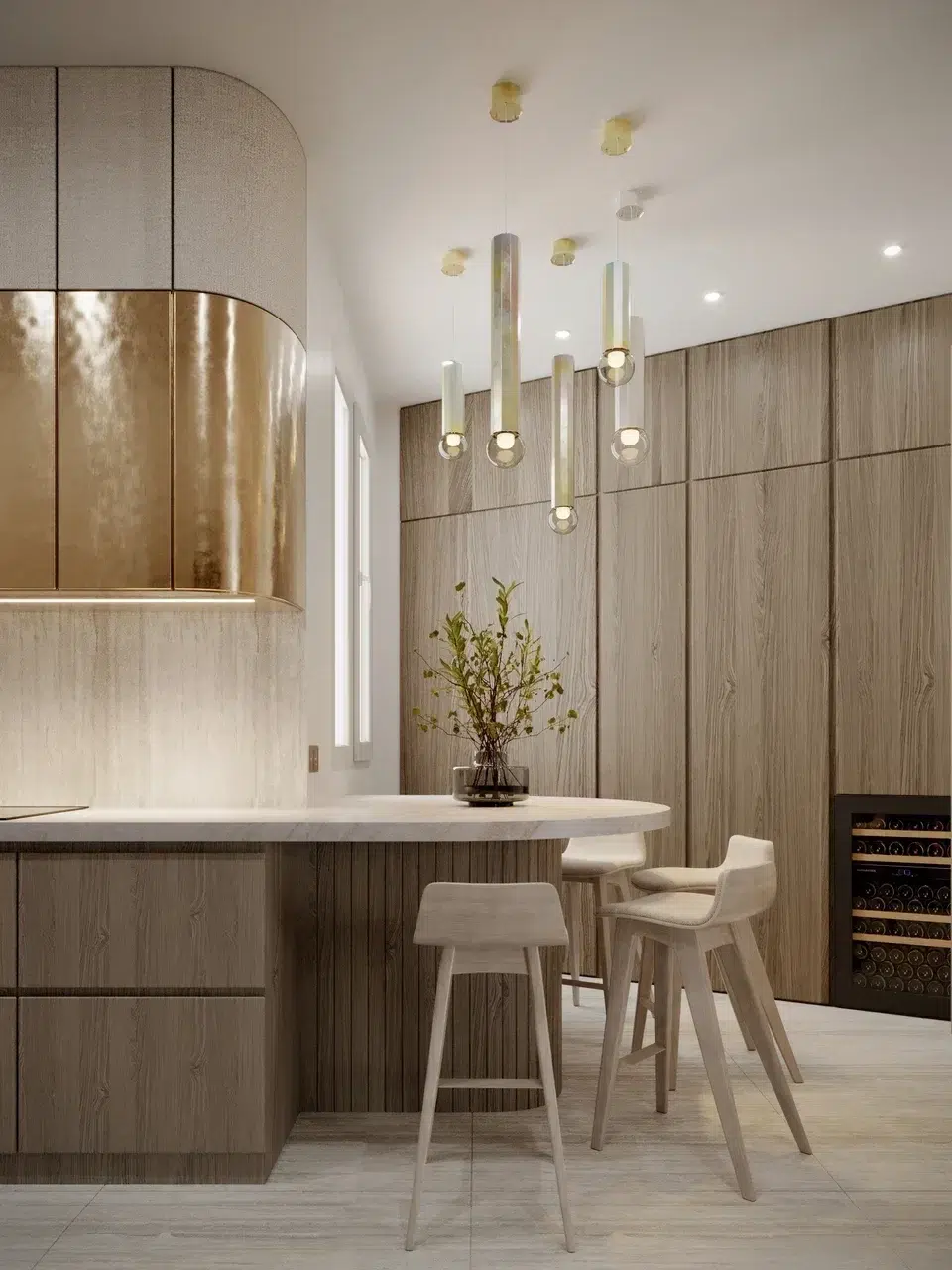 🧱 Matériaux : Stratifié métallique doré, textures douces, matériaux naturels et imprimés organiques