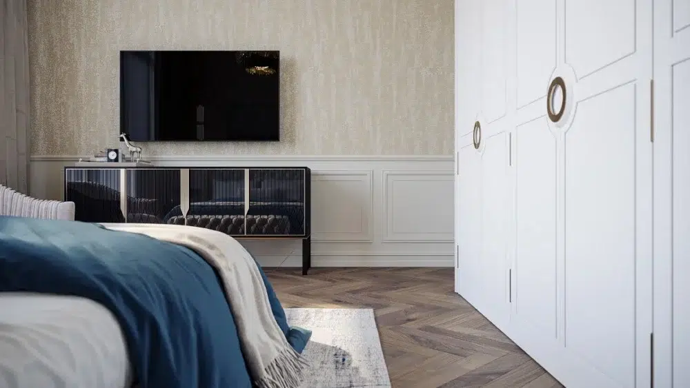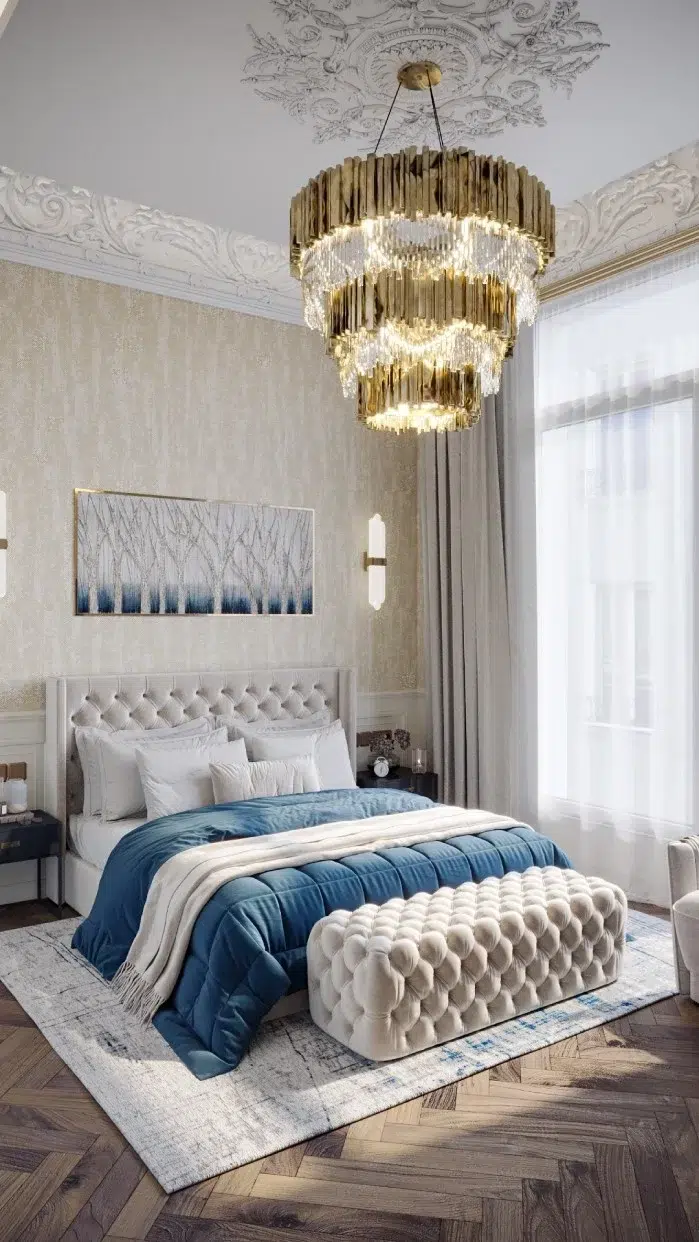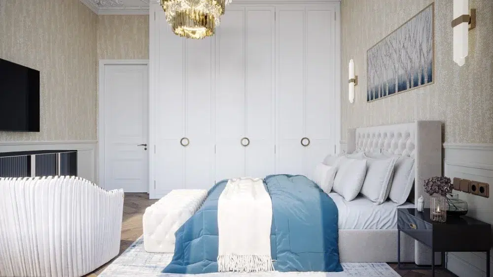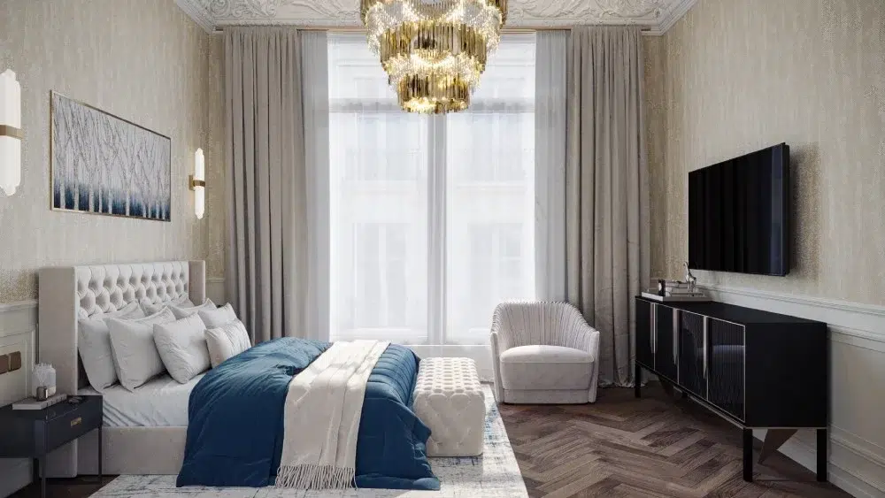 L’élégance de ce projet réside dans l’équilibre entre confort et prestige. Nous avons privilégié des textiles doux et des tonalités pastels pour instaurer une base chaleureuse. Cette douceur est contrastée par des éléments décoratifs en plafond et une quincaillerie soigneusement sélectionnée, qui confèrent à l’ensemble une élégance majestueuse et une certaine solennité architecturale. Le confort n’est pas en reste, avec une salle de bain généreusement dimensionnée, pensée comme une véritable bulle de bien-être quotidien.