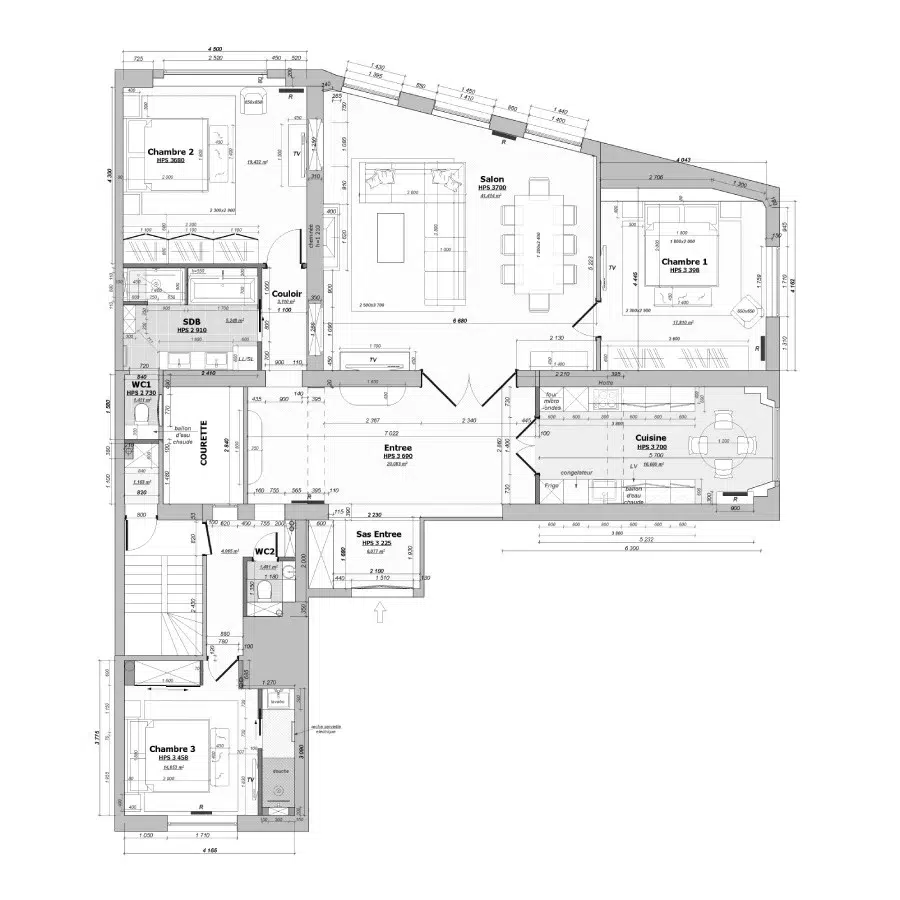 🎯 Synthèse technique : Redistribution structurelle majeure incluant le déplacement des réseaux pour la nouvelle cuisine et la création d’espaces de vie ouverts.