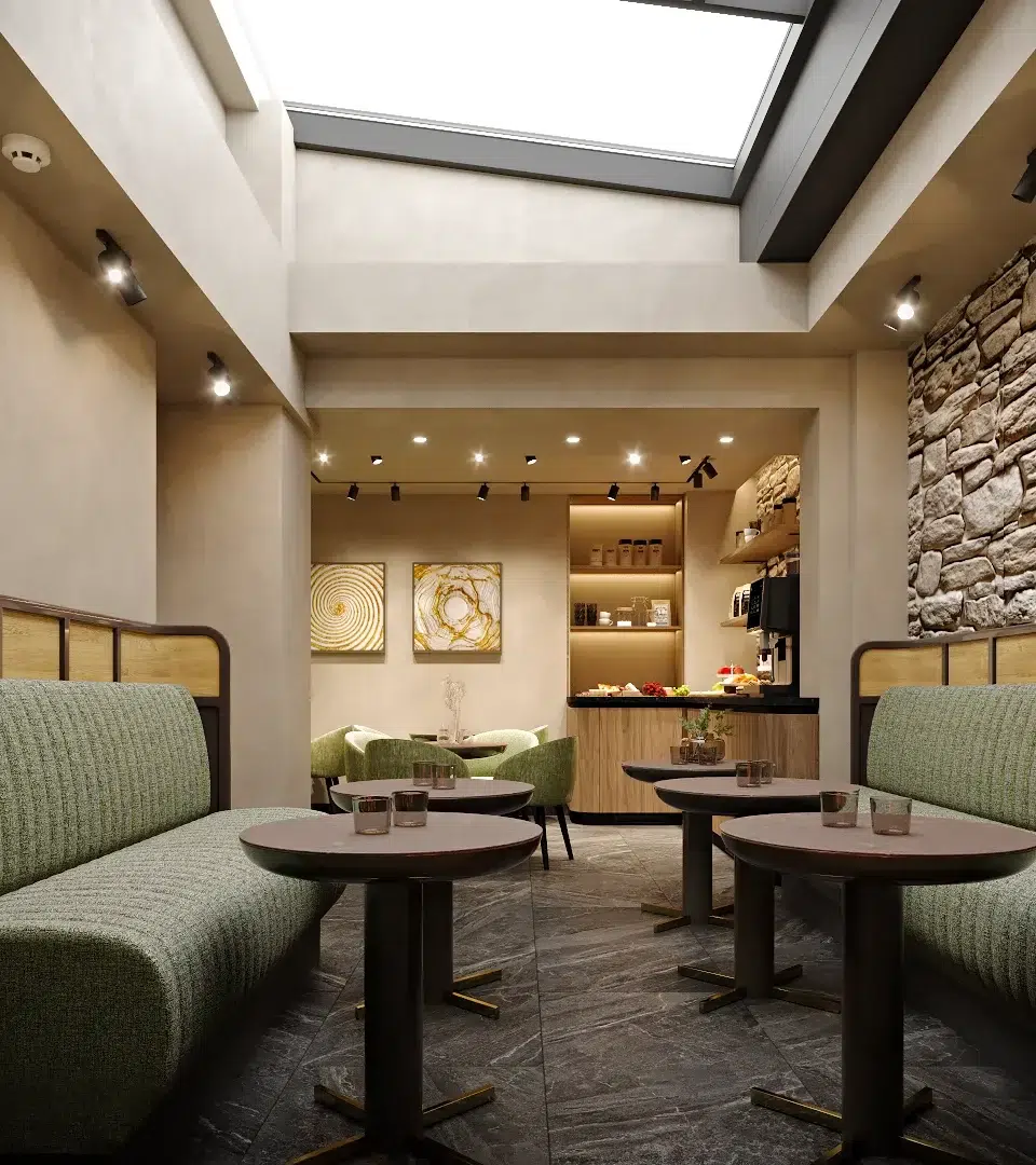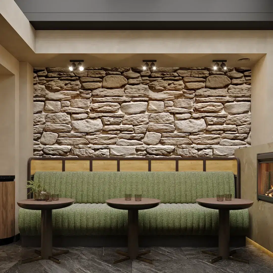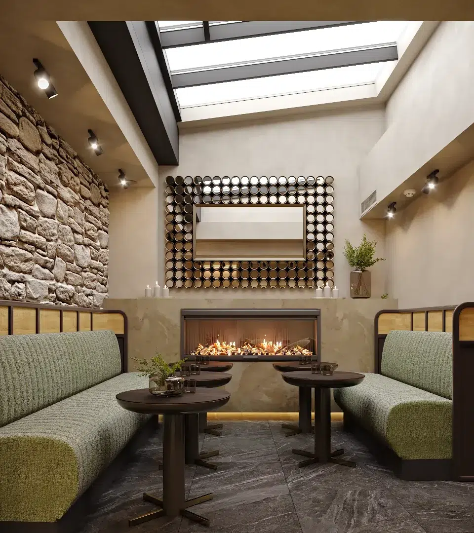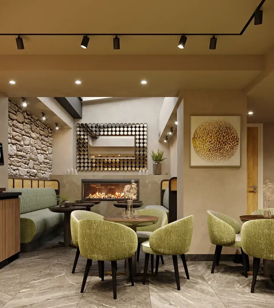 L’enjeu majeur de cette rénovation était de transformer la salle du petit-déjeuner en un véritable cocon de douceur. Nous avons privilégié l’utilisation du vert amande et de matières tactiles, contrastées par la noblesse d’un mur en pierre apparente et la chaleur du bois. Pour ancrer cette atmosphère, un foyer moderne a été intégré directement dans la maçonnerie, devenant le cœur vibrant de la pièce et diffusant une lumière apaisante dès les premières heures de la journée.