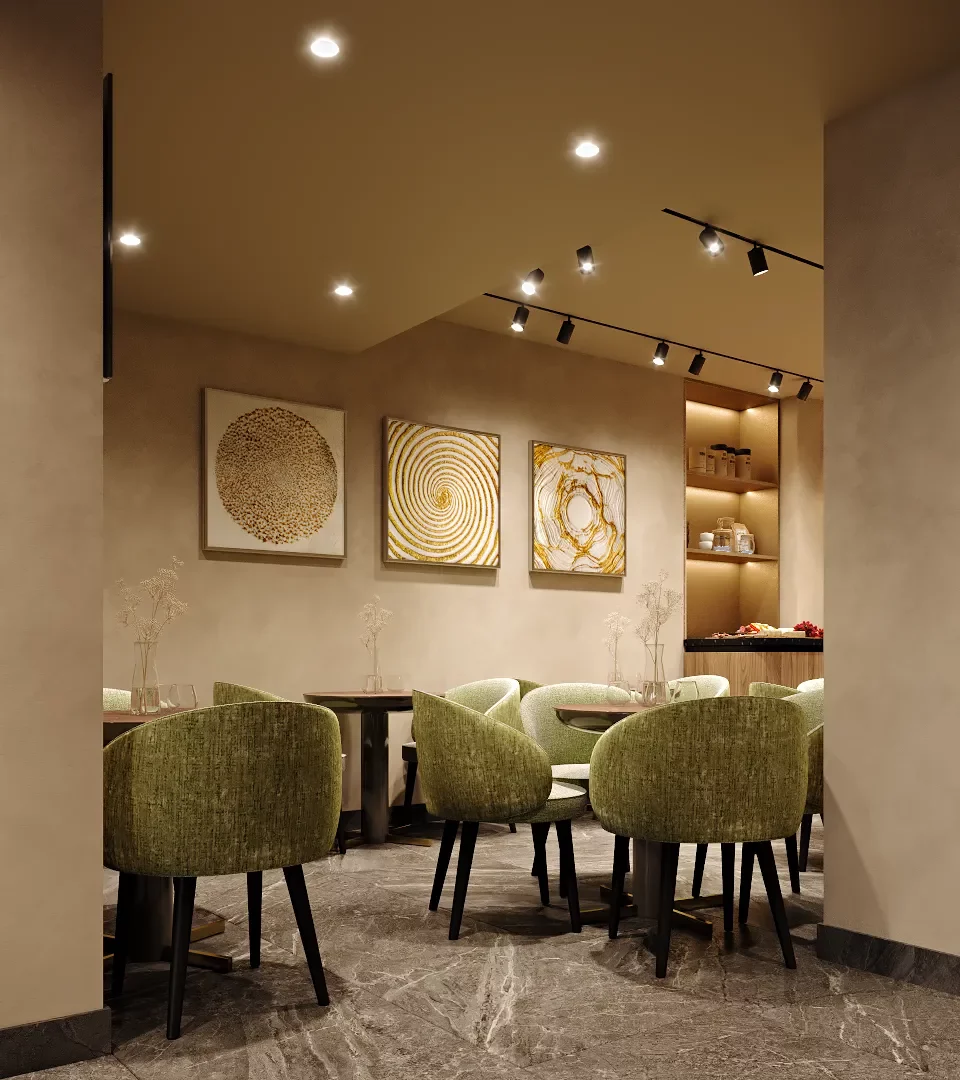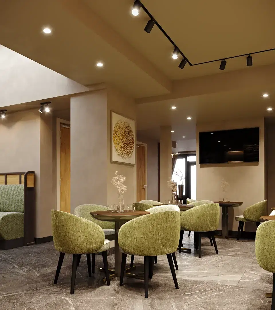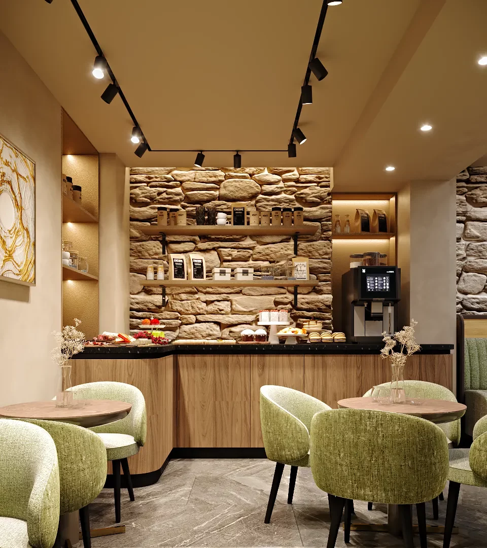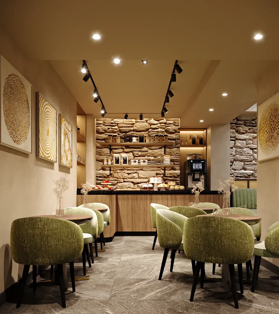L’enjeu majeur de cette rénovation était de transformer la salle du petit-déjeuner en un véritable cocon de douceur. Nous avons privilégié l’utilisation du vert amande et de matières tactiles, contrastées par la noblesse d’un mur en pierre apparente et la chaleur du bois. Pour ancrer cette atmosphère, un foyer moderne a été intégré directement dans la maçonnerie, devenant le cœur vibrant de la pièce et diffusant une lumière apaisante dès les premières heures de la journée.