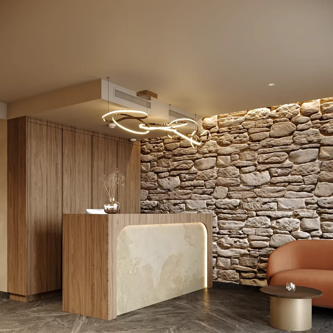 🧱 Matériaux : Pierre apparente, bois naturel, miroirs circulaires, textiles doux.